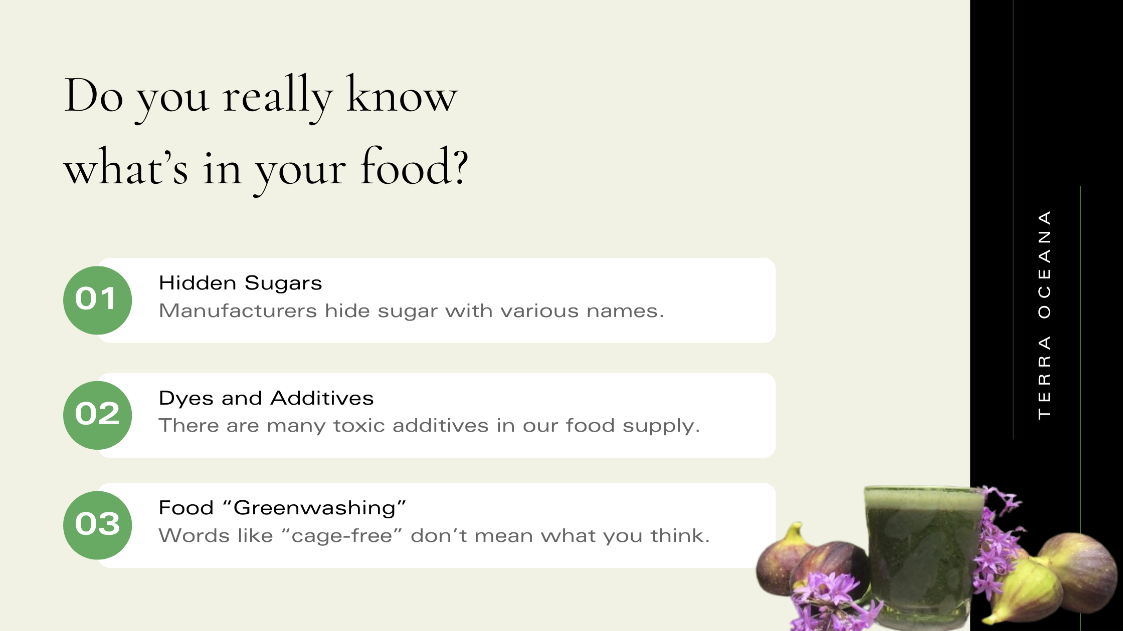 At TerraOceana, we believe in transparency, integrity, and quality. Our supplements are formulated with Certified Organic, Whole Food Ingredients—because nothing less should ever be an option when it comes to your health.